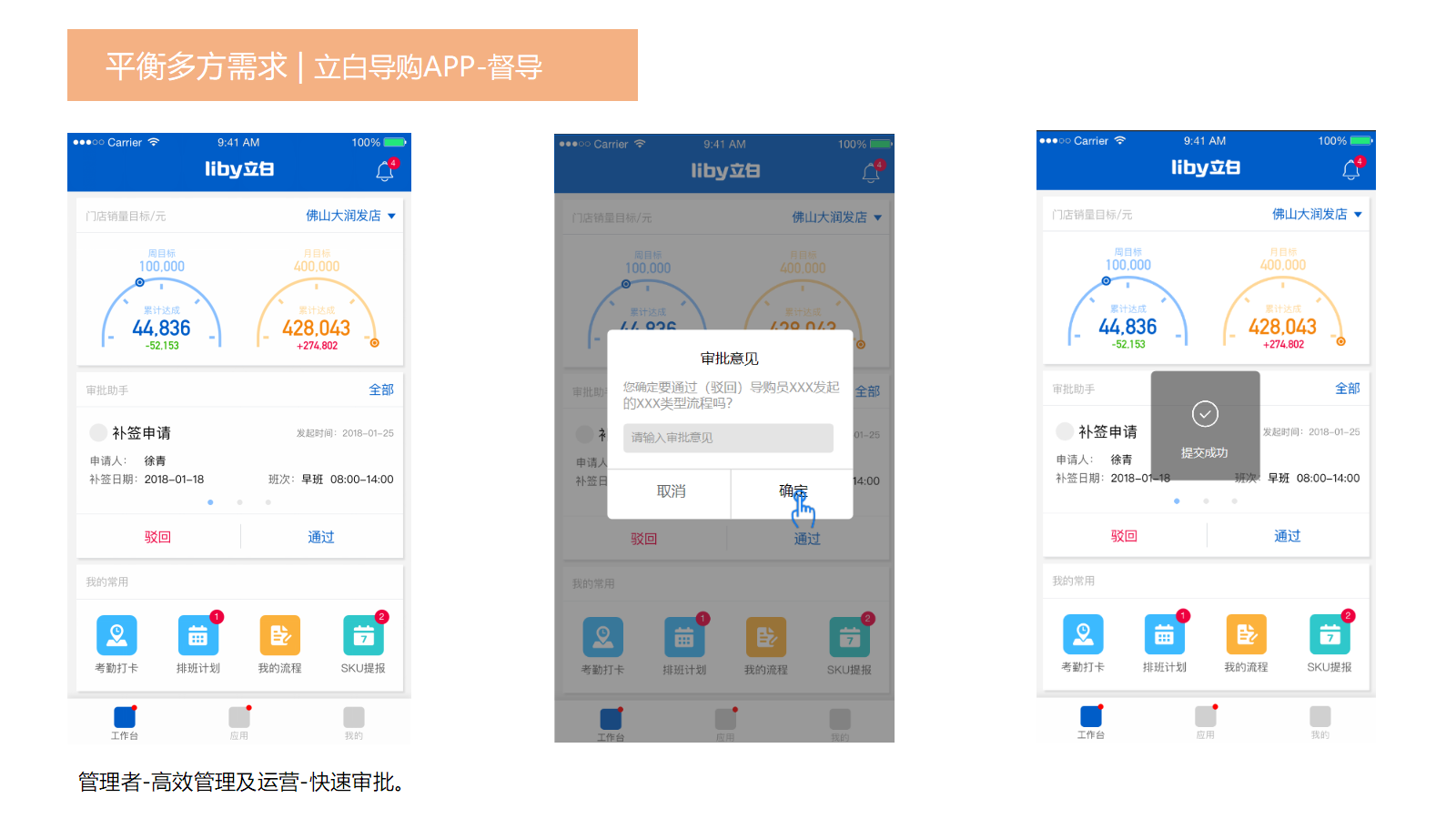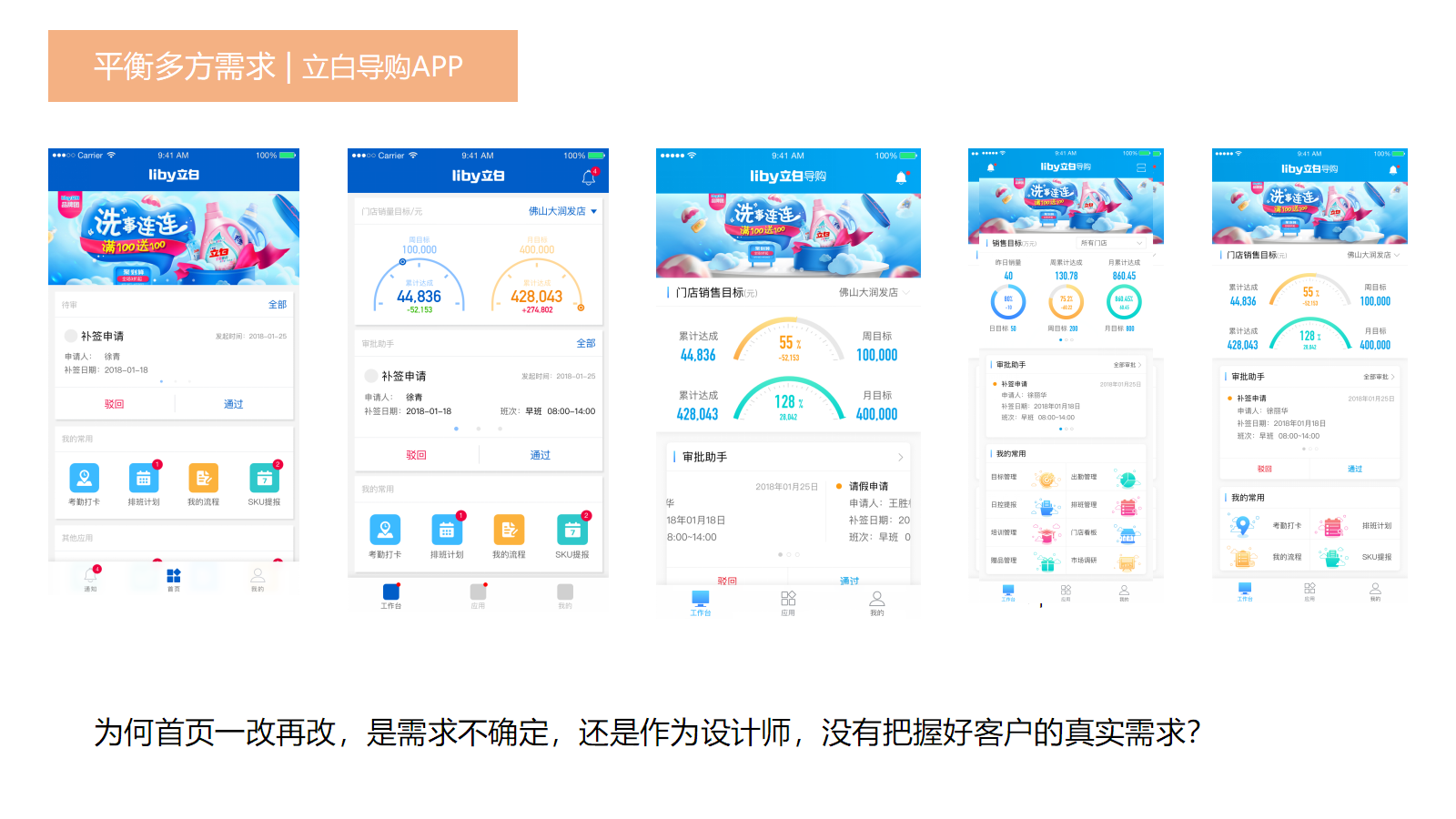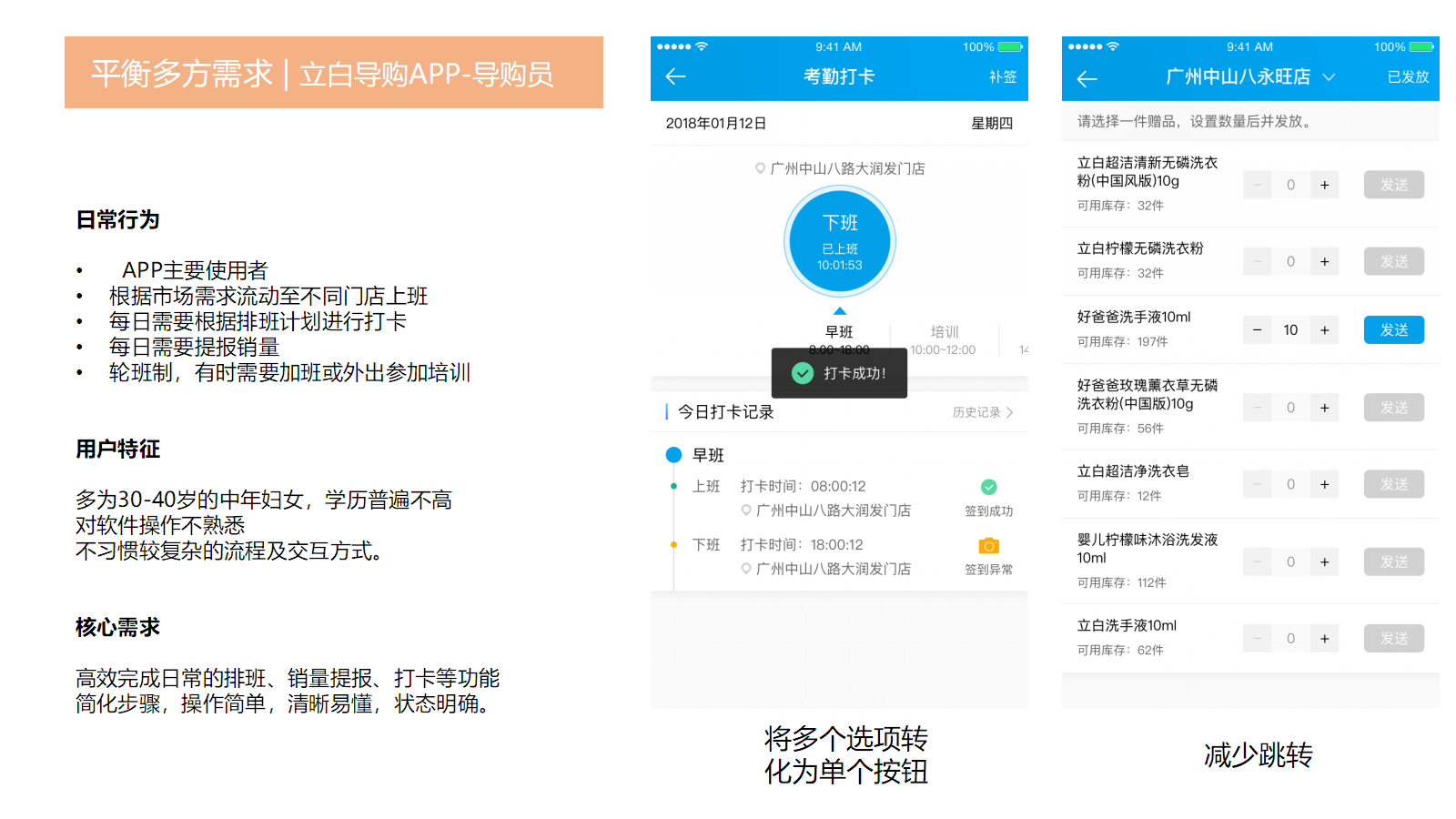 如近期完成的立白导购App项目中,拍板,做决策的客户往往是高层领导,他们更在乎的是这个产品的功能是否齐全,是否有量化的数据能激烈员工,可视化的数据报表帮助管理层更好地做出决策,而管理层,例如督导的核心需求是能否在多个门店之间快速切换,高效地完成日常繁琐的审批工作,对所管辖的底层导购员能实现批量管理。而最为底层的导购员,因文化成本不高,他们需要的是一个简单,容易操作的App,没有太高的学习成本,能帮助他们完成每日打卡、考勤、销量提报等工作。