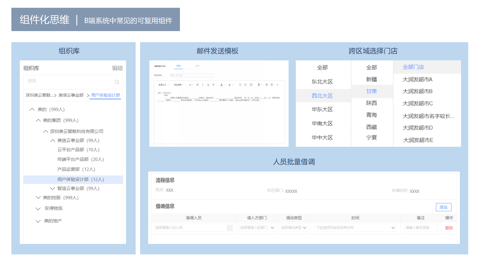同时设计师还需要思考的是,B端产品因为业务功能的庞大,一个系统的页面往往或成百上千,设计师不可能对每个页面都精心设计,因此必须要在众多页面和元素中提炼出共性问题,给出通用的解决方案。为了节省设计复杂表单的重复性的工作成本,还需要思考像乐高积木一样将各式各样的需求和功能点拆分成有共性的,复用性比较高的组件,在搭建其他系统的时候能够快速将这些标准化的组件合理重组,以释放设计师的双手,让设计师有更多的时间去思考用户的真实需求和更完美的方案,而不至于被设计稿淹没。