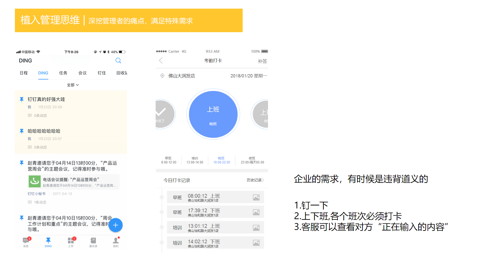 企业级的产品,很多需求和痛点都是管理上的需求和痛点,虽然有时很多业务需求我们站在用户的角度确实觉得体验很不好,但站在管理层的角度,就会发现确实是真实存在的。这时,设计师要做的是如何在管理层的强需求和用户体验之间做到平衡。