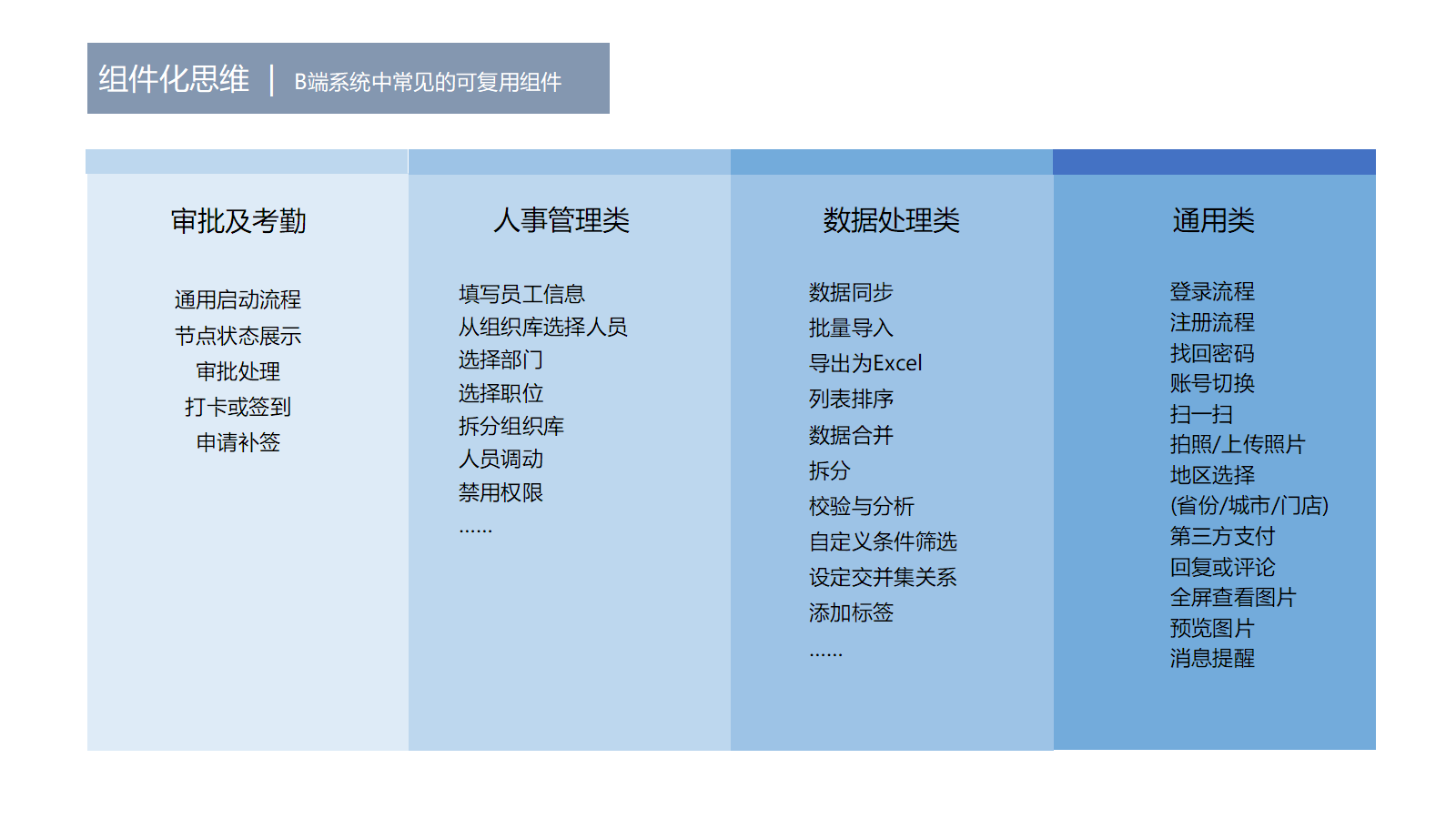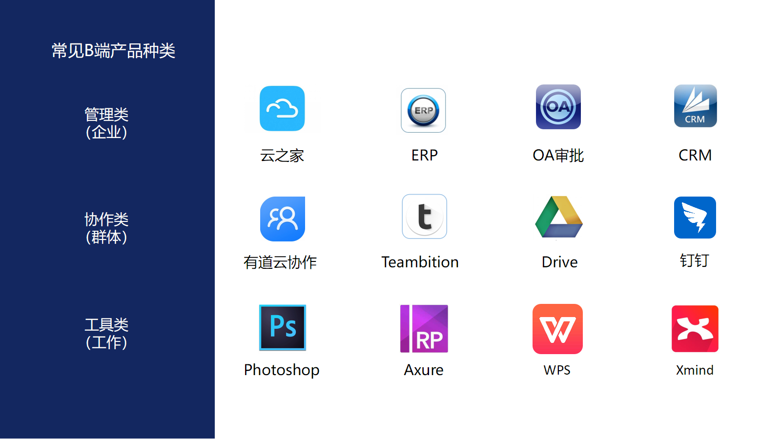 同样, 一家公司能够正常运作,离不开市场、销售、人事、财务、法务、IT、采购等各个部门的工作和配合。为了提升企业员工的工作效率,满足企业在管理层面的需求,也诞生出了越来越多的B端产品,大致归为以下三类。