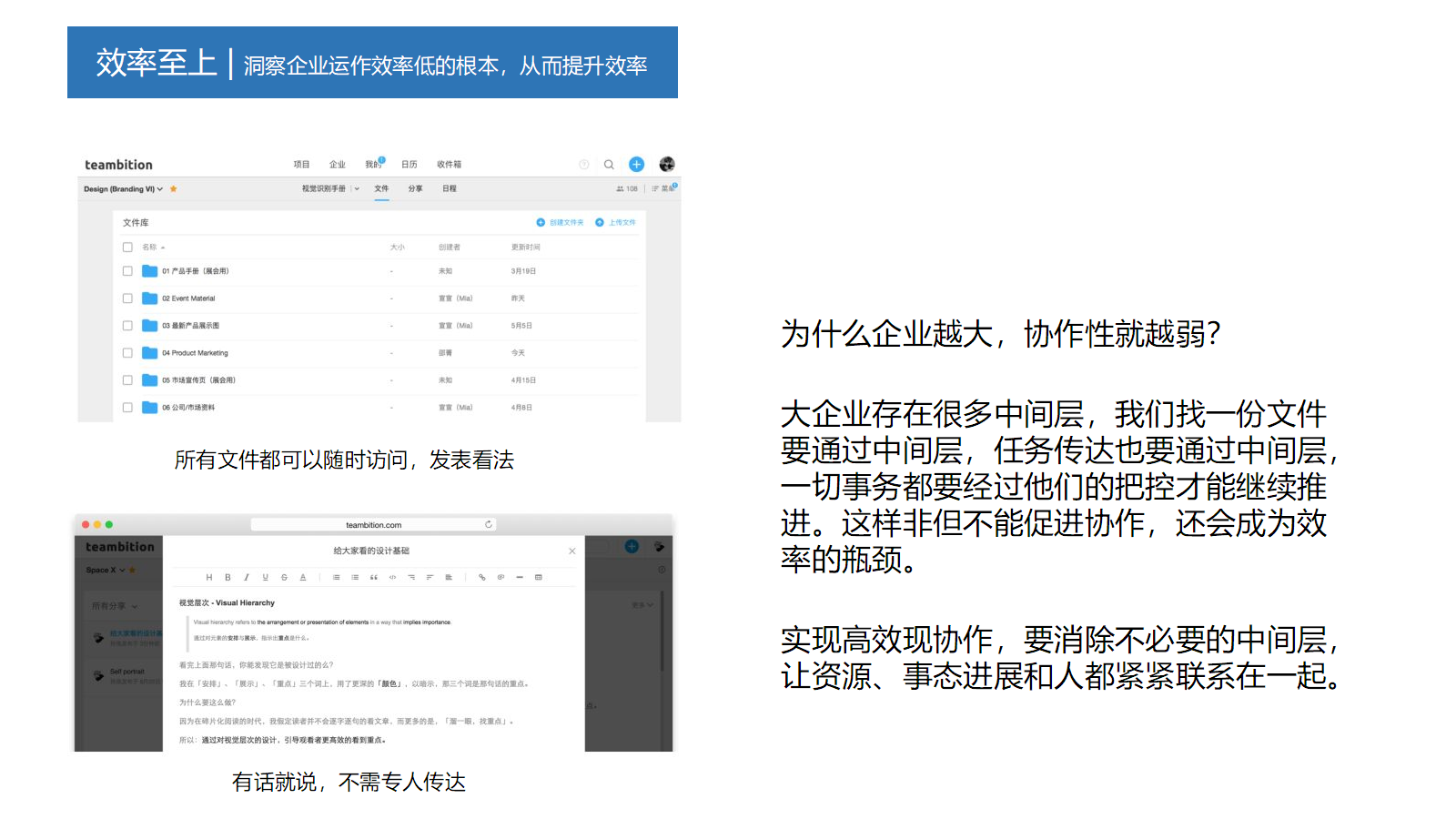 例如Teambition,真正洞悉了企业管理痛点,所有文件,有权限的成员都可以随时方案,发表看法,以达到资源共享,高效协同。