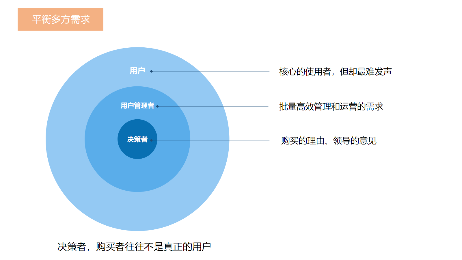 在做C端产品设计时,我们也需要应对来自不同年龄层和不同背景的多种用户的需求,可能更难把握。而B端产品的用户往往有非常强的职业属性。因职位的不同,每个角色都有各自的使命和任务,作为设计师,切不可因为客户的强势要求而忽略了背后真正使用产品的广大底层员工的真实诉求。这些最底层的员工是公司的弱势群体,发声机会少。而决定购买产品的客户往往是有着更多权利的管理层,他们身居高层,并不一定能完全理解底层员工的真实愿望。