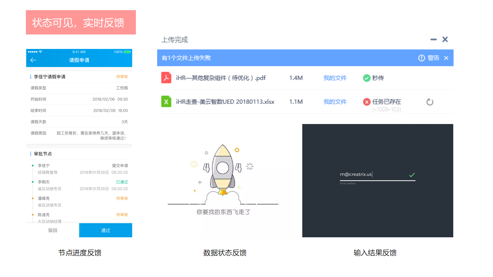 无论是底层员工还是领导层,在工作时难免会遇到被打断的情况,此时当用户放下手头上的工作去协商其他事宜,回到任务时是否能在第一时间进入状态,这就需要我们给用户最及时的反馈和状态提示。让用户能时刻了解到自己的状态和剩余的步骤,减少困惑。