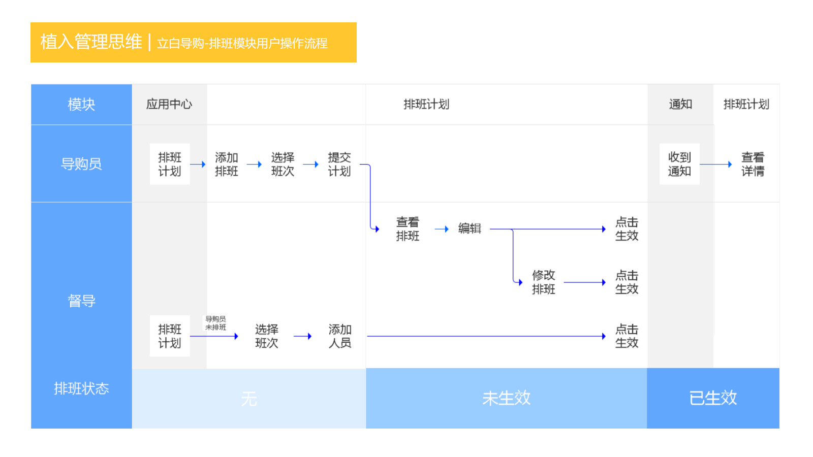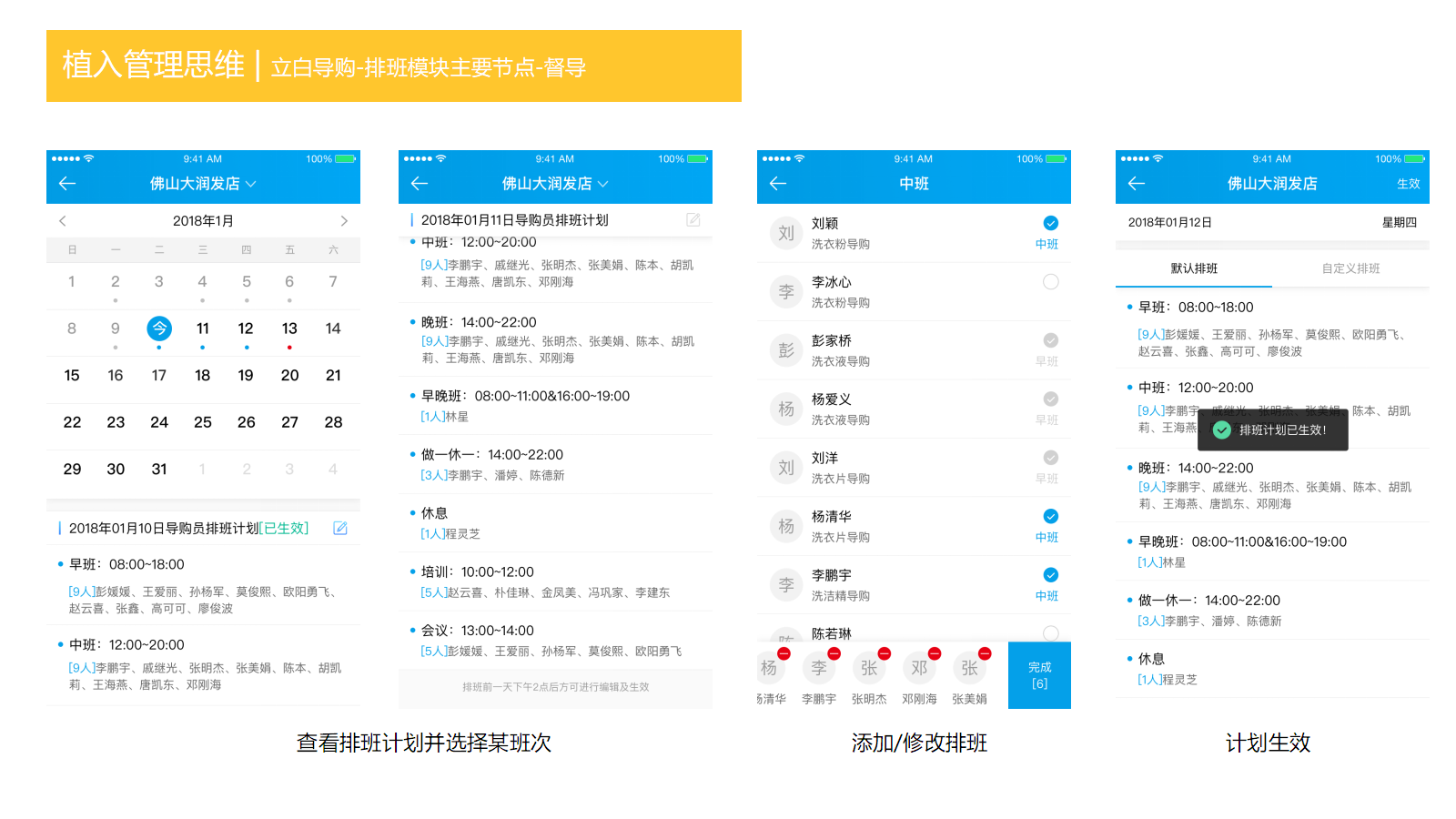 排班也是一样,一定要考虑多个导购员排班时,督导如何配合,实现批量管理的同时又不产生冲突和遗漏。同时也要保证通知模块和排班模块 状态的一致性。