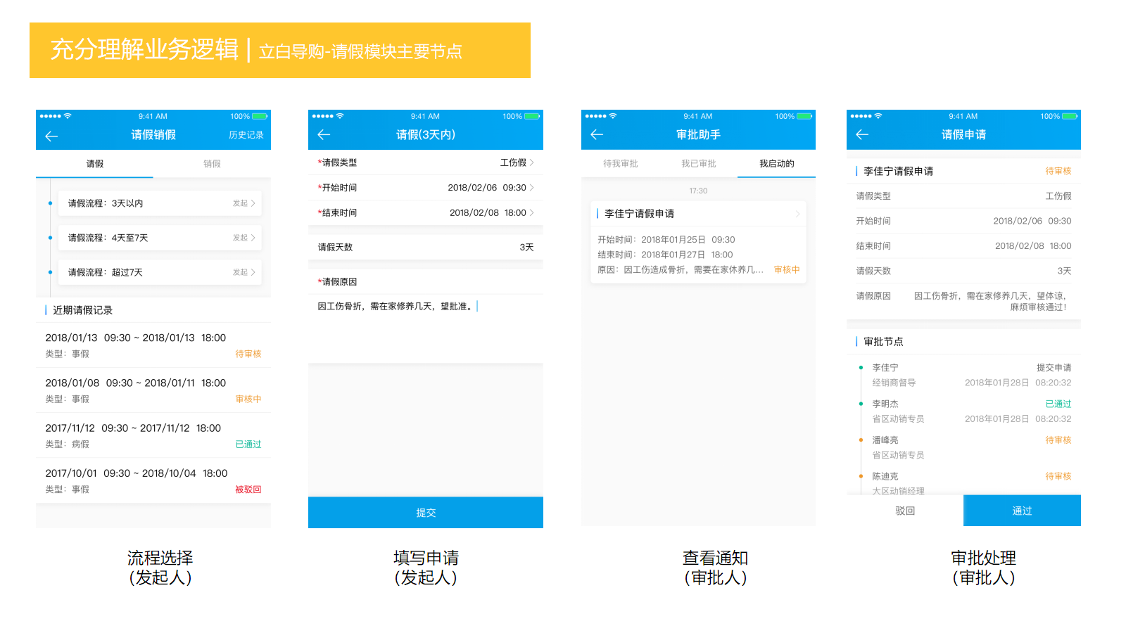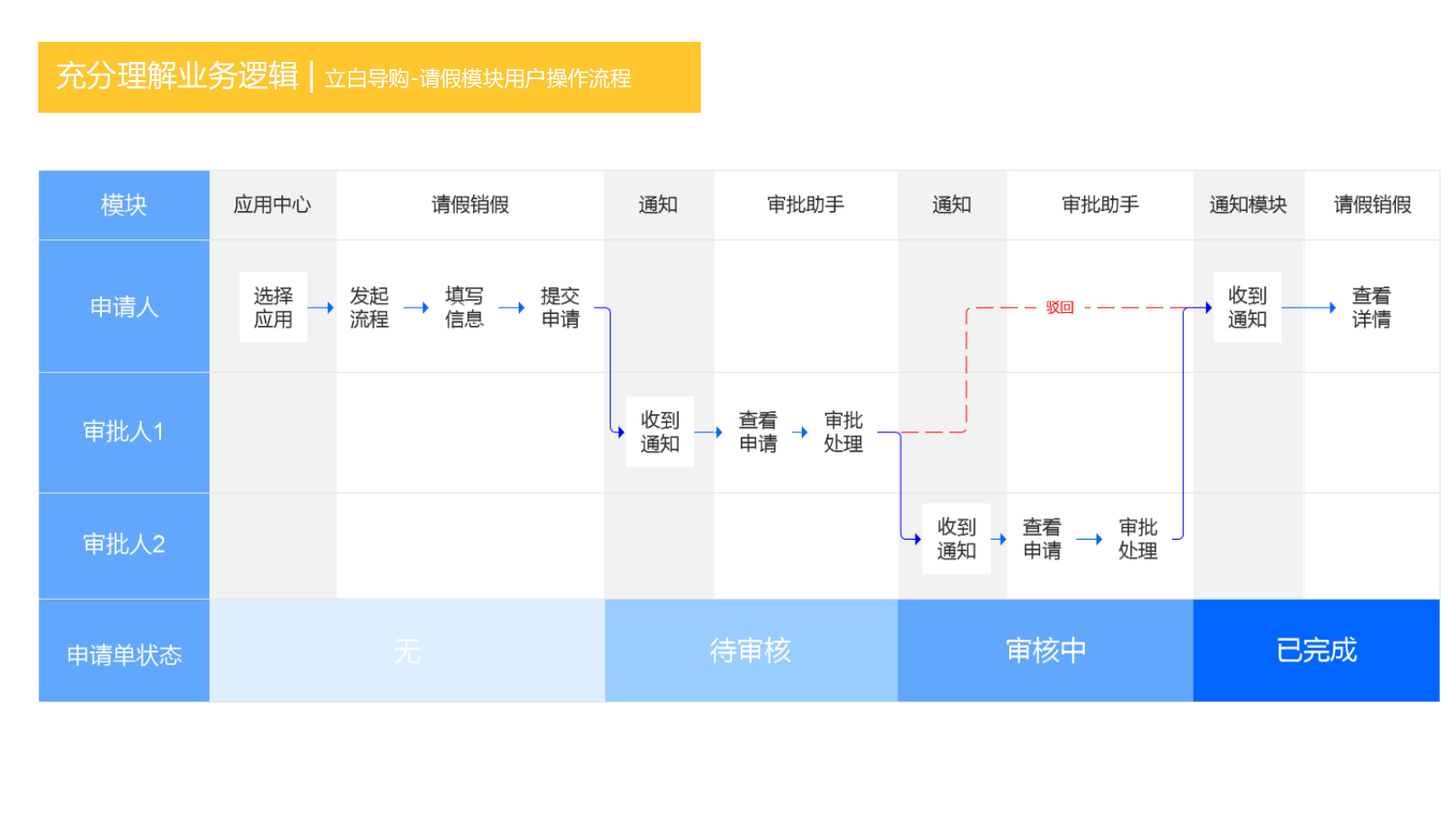 B端产品因业务功能的特殊和复杂性,往往流程较为复杂,例如最为常见的请假销假,设计时一定要从头到尾理清楚用户操作的关键节点,保证流程的闭环,同时在设计时要考虑到多个角色之间的交互,以及不同模块之间的响应配合,不可只考虑一个独立模块里的操作,避免因流程不完整而缺失页面。梳理完流程后,实际上就可以梳理出最关键的几个页面,保证流程走得通。而剩下的工作,则是对一些异常情况的考虑和细节的处理。
